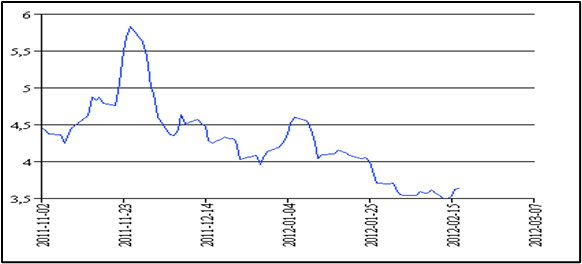 Graphique 1 : Évolution des taux (OLO 10 ans) entre novembre 2011 et février 2012
