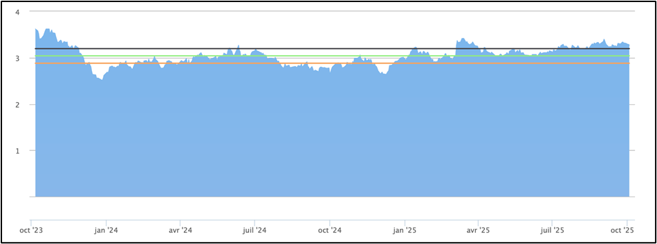 Graphique 2 : évolution des taux à 10 ans entre octobre 2023 et octobre 2025