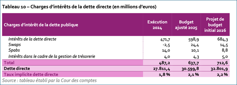 - Les intérêts de la dette directe augmentent encore de 70 millions en 2026