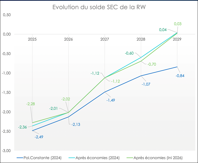 Dans tous les cas, ce retour à l’équilibre SEC est essentiellement dû à la fin du plan de relance de la Wallonie, celles-ci vont en effet passer de 675 millions d’euros en 2026 à 150 millions d’euros en 2029, et non aux « économies structurelles ». La Cour des comptes est très claire à ce sujet : « Dans les projections présentées par le gouvernement, l’amélioration du solde budgétaire et du solde de financement s’explique principalement par la diminution progressive, d’année en année, des dépenses liées au plan de relance pour atteindre 150,0 millions d’euros en 2028 et en 2029 (contre 674,8 millions d’euros au projet de budget initial 2026). »