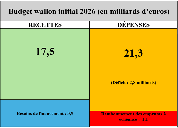 Le gouvernement wallon nous présente donc un budget 2026 avec 17,5 milliards de recettes et 21,3 milliards de dépenses, et donc un déficit budgétaire de 2,8 milliards.