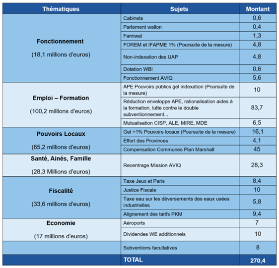 - Politiques de l’emploi : -100 millions d’euros, dont une réduction des subventions d’aides à l’emploi (APE) de 30 millions, une réduction des aides à la formation pour 20 millions € ;